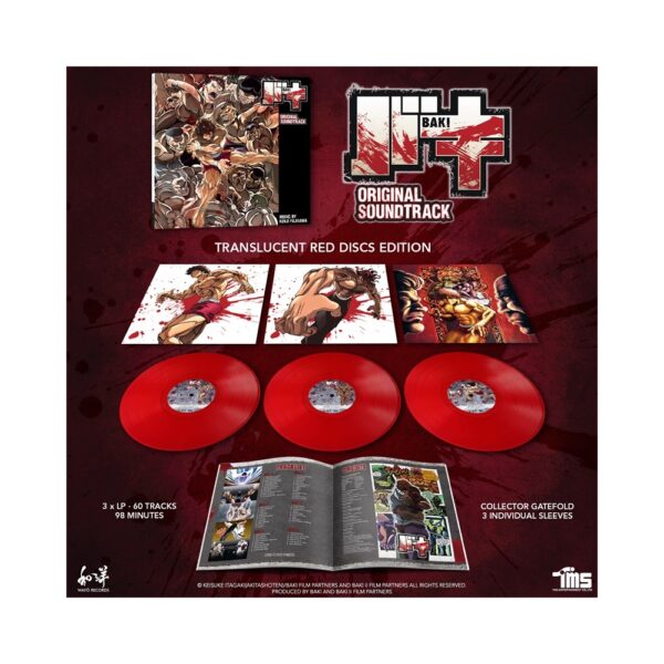 BAKI is the hit series produced by TMS Entertainment and airing from 2018 on Netflix. Here at last is it's smashing soundtrack composed by Kenji Fujisawa, fully remastered in vinyl format in a translucent red 3LP edition!
